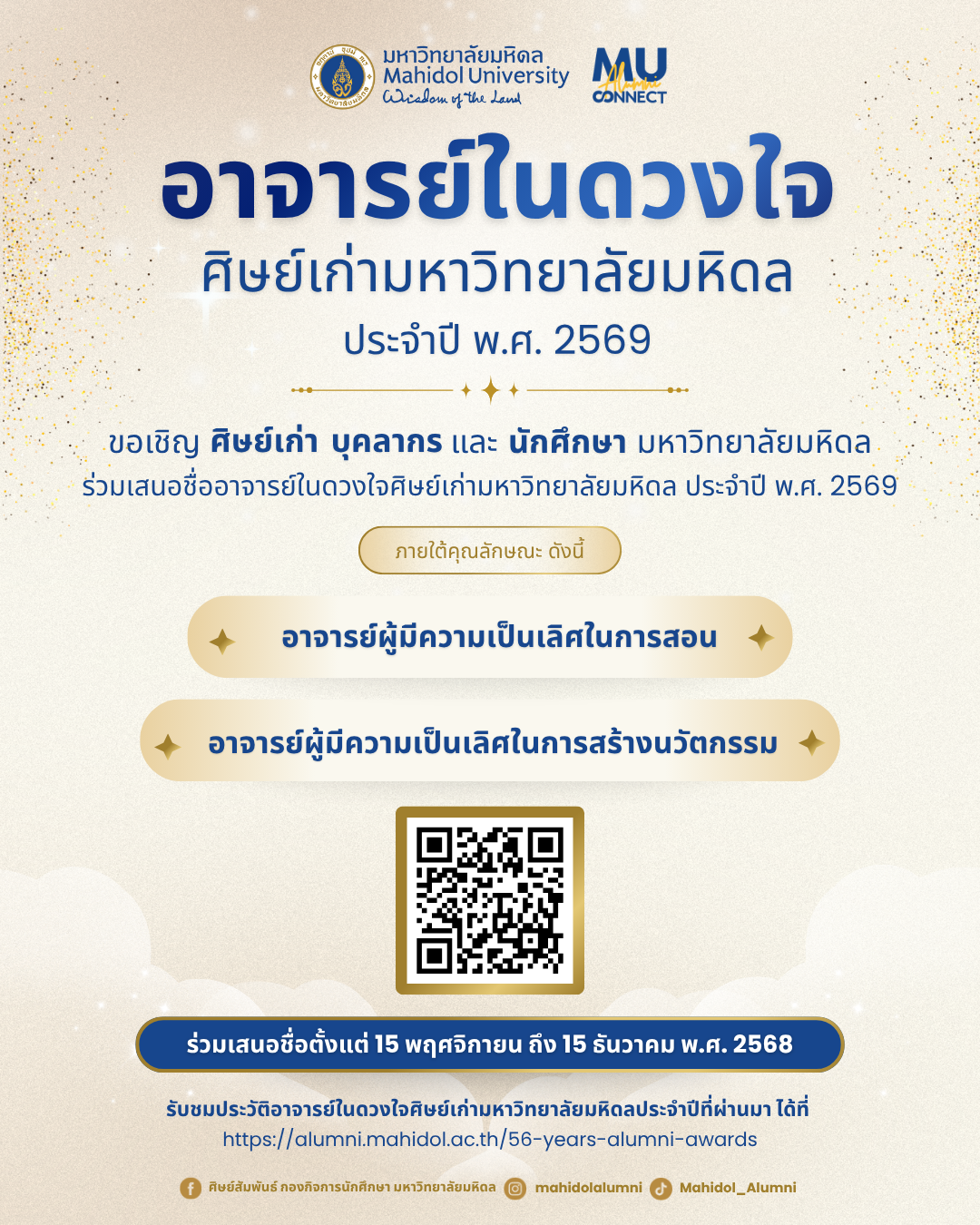🗂️ รับชมประวัติอาจารย์ในดวงใจศิษย์เก่ามหาวิทยาลัยมหิดลประจำปีที่ผ่านมา ได้ที่ https://alumni.mahidol.ac.th/56-years-alumni-awards