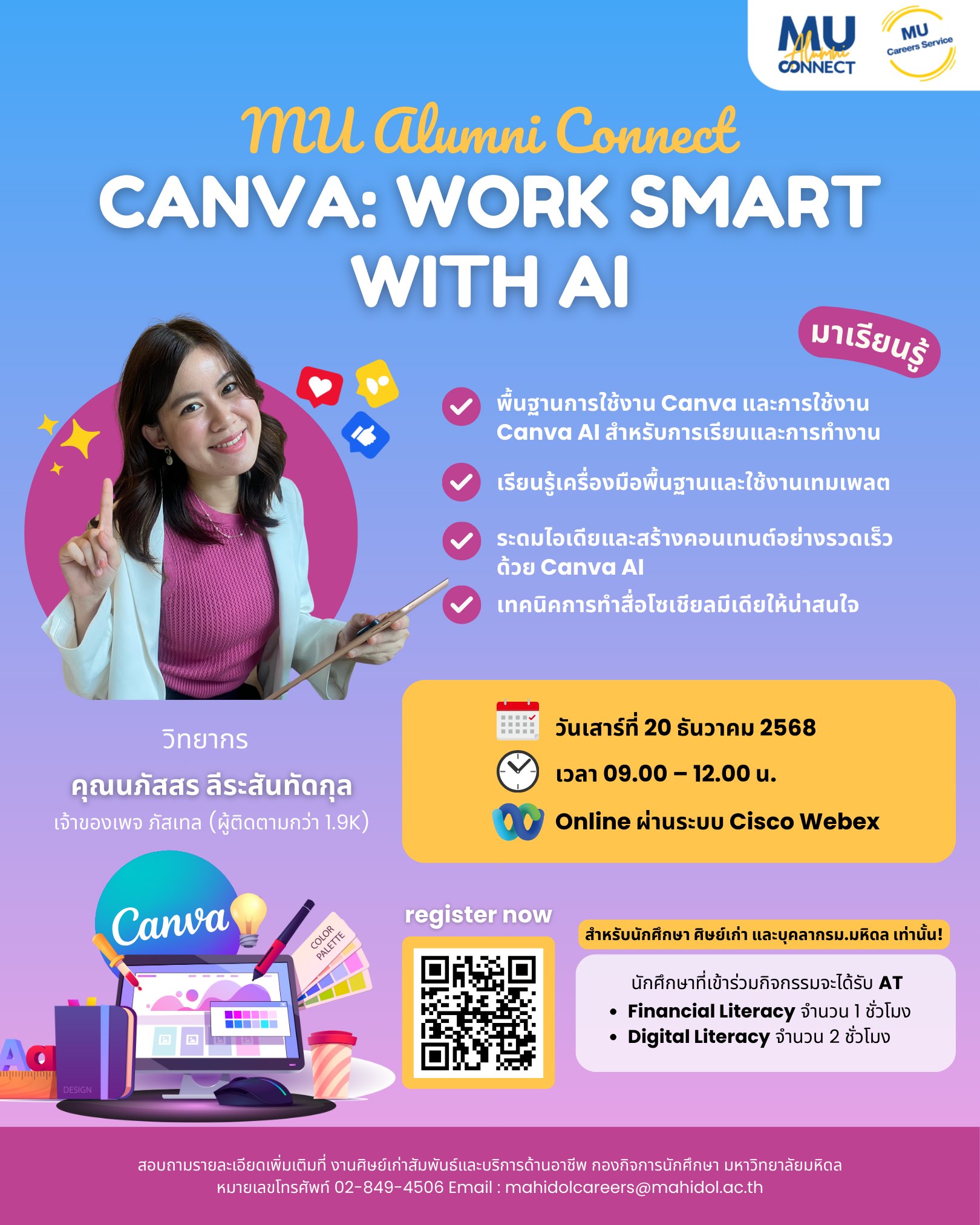 👀พร้อมมา Upskill Reskill การออกแบบกันไหม? 🎨✨ ขอเชิญนักศึกษาและศิษย์เก่ามหาวิทยาลัยมหิดลเข้าร่วมกิจกรรม MU Alumni Connect "Canva: Work smart with AI"